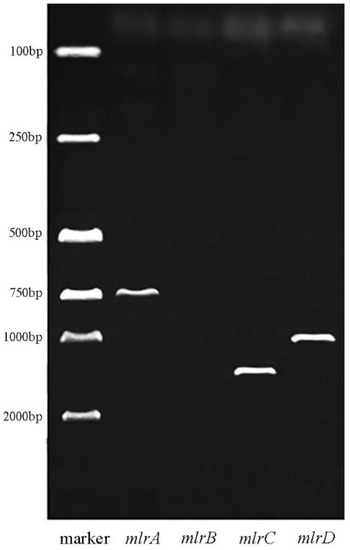 mlrA, mlrB, mlrC and mlrD PCR amplified products gel electrophoresis of strain a7.