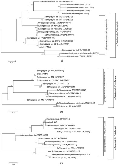 The mlrA, mlrB, mlrC, and mlrD specific primers were used for PCR amplification of a7, and the agarose gel electrophoresis of the PCR products is shown in Figure 3. Three bright DNA bands were observed after amplification, except for mlrB gene, and the fragment size was about 750, 1300, and 1000 bp. Thus, strain a7 contained the key enzyme gene mlrA, mlrC, and mlrD, which might be involved in the process of MC degradation. The PCR fragments were subsequently sequenced. The sequences of mlrA, mlrC, and mlrD from a7 were 99%, 100%, and 98% similar to the genes obtained from Sphingomonas sp. USTB-05, Sphingomonas sp. USTB-05, and Sphingopyxis sp. C-1, respectively. The amino acid phylogenetic trees of mlrA, mlrC, and mlrD genes were constructed based on the comparison with amino acid sequences of high-homology bacteria (MEGA5, Figure 4).