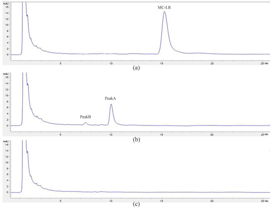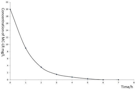 MC-LR was measured by HPLC system (Agilent 1100, Santa Clara, CA, USA) with a Zorbax Extend C18 column (4.6 × 50 mm, 5 μm, Agilent, Santa Clara, CA, USA), which was kept at 40 °C. A mixture of methanol and 0.05% trifluoroacetic acid aqueous solution (53:47, v/v) was used as mobile phase. The flow rate was 1 mL/min, and the injection volume was 20 μL with 238 nm of variable wavelength detector [28].