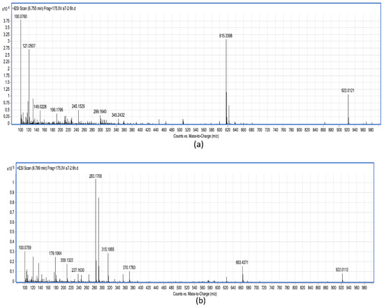 Electrospray ionization time-of-flight mass spectrometry (ESI-TOF-MS) spectrum of MC-LR degradation product. (a) MC-LR degradation product peak B with a molecular weight of 615.3398 ([M+H]+). (b) MC-LR degradation product peak A with a molecular weight of 283.1700 ([M+H−NH3−MeOH]+).