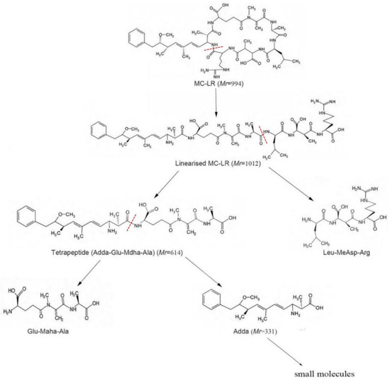 Microcystins (MCs) are cyclic heptapeptides with seven amino acids, and are considered one of the most hazardous groups of toxins produced by harmful cyanobacterial blooms (HCBs) [1,2]. These toxins are cyclic heptapeptide hepatotoxins and tumor-promoting substances [3,4]. All MCs consist of the generalized structure cyclo-d-Ala1-X2-d-MeAsp3-Z4-Adda5-d-Glu6-Mdha7 (Figure 1) [5]. MC-LR, which has leucine (L) at position 2 and arginine (R) at position 4, is the most toxic among MCs [6]. Degradation products probably are linearized MC-LR, tetrapeptide, Adda, and other small molecules resulting from cleavage [7,8].