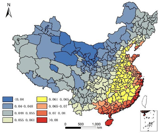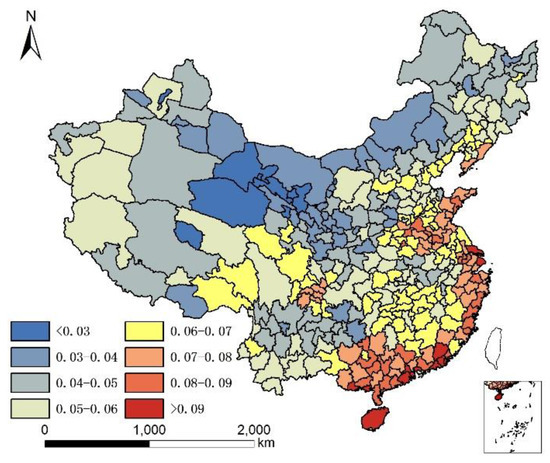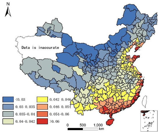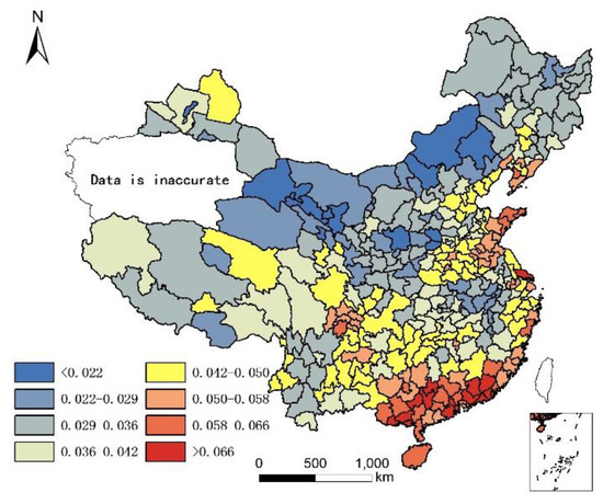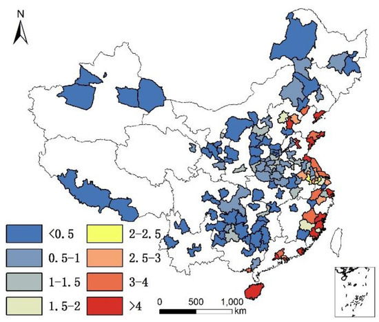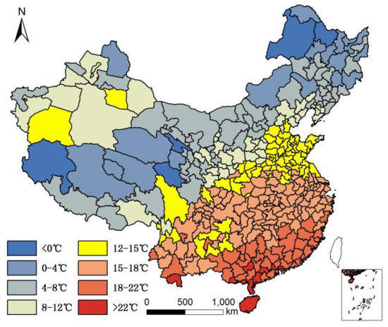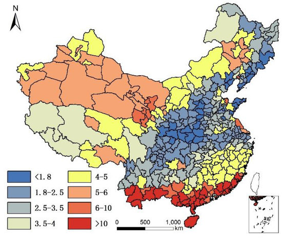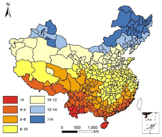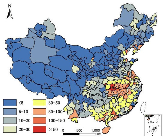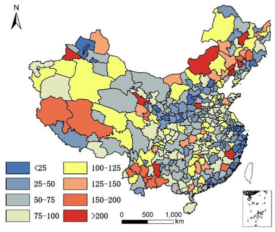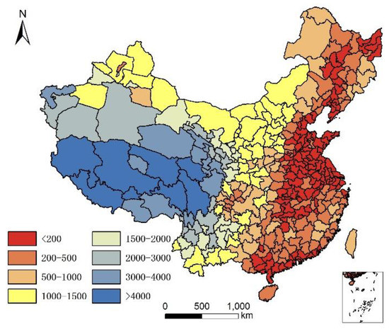 We downloaded the digital elevation model (DEM) of China (resolution: 1 km × 1 km) from the data cloud of the Chinese Academy of Sciences (http://www.csdb.cn/), and subsequently calculated the average altitude of each city using zonal statistics analysis tools and ArcGIS software with the DEM data and map of each city. Average city altitudes are illustrated in Figure 6.