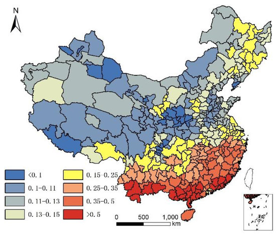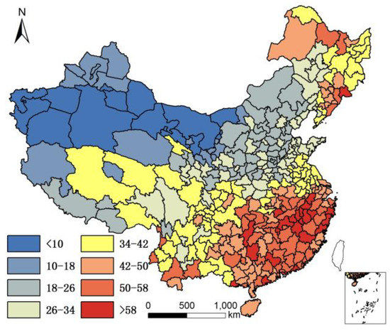 In this equation, I represents humidity; P is annual average precipitation (mm); T is annual average temperature (Centigrade). Each city’s humidity is illustrated in Figure 5 with higher values indicating higher humidity.