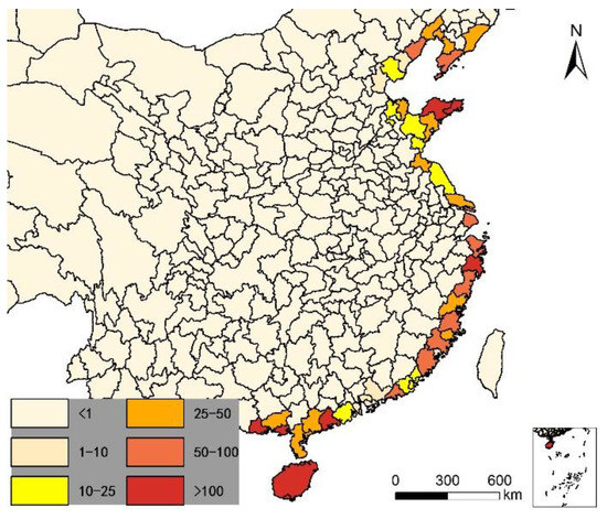 In the past, especially 20 years ago when China’s highway network was not built, and food freezing technology was not developed, sea fish were seldom transported inland. Because sea fish will quickly die and deteriorate after leaving seawater, they were almost exclusively eaten by coastal-area residents. Even today, most sea fish in China are consumed by coastal area residents. There is no accurate per capita sea fish consumption data for Chinese cities, so we launched an investigation of the frequency of sea fish consumption, per month, for the residents of 139 cities in China, as a representative sample of the whole country. It would be too difficult to obtain this data from all cities, so the 139 selected cities account for 40.3% of all cities in China, and are distributed throughout every part of the country, as illustrated in Figure 12. Frequency of sea fish consumption is related to distance from the sea. In coastal cities, residents eat sea fish 3–10 times per month, while in inland areas most consume sea fish fewer than one time per month. We evaluated the consumption of sea fish for each city according the city’s per capita sea fish consumption and seawater food production in coastal regions (Equation (2)):