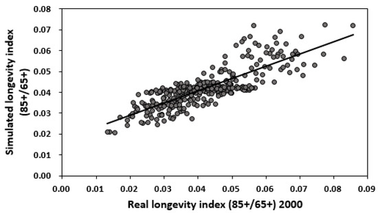 Relation between real longevity index and simulated longevity index by humidity content in soil, altitude and per capita sea fish consumption in 2000.
