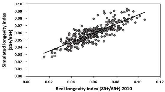 Relation between real longevity index and simulated longevity index by humidity content in soil, altitude and per capita sea fish consumption in 2010.