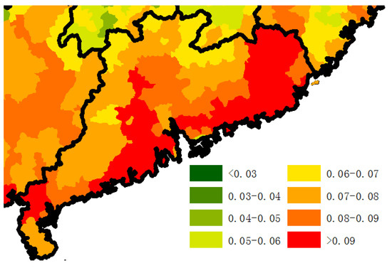Sea fish consumption appears as an important factor in both stepwise MLR and GWR. The consumption of sea fish, kelp, seaweed, jellyfish, mussels, and other sea foods are excellent sources of protein and unsaturated fatty acids. They also supply inorganic salts, which hinder the absorption of cholesterol in the intestines, all of which are associated with healthy diets. Almost all the cities along the coast, whether developed or poor, had high longevity ratios. Although some coastal cities in China are richer, one-third of them remain below the average gross domestic product (GDP) for all cites in China, including Huludao, Dandong, Jinzhou, Yingkou in Liaoning province, Shanwei, Jieyang, Chaozhou, Zhanjiang, Shantou, Maoming in Guangdong province. A relatively low longevity ratio was found in the coastal regions of Hebei province, where the production of sea fishing was also lowest among the coastal regions. In Guangdong province, the longevity ratio gradually decreases moving inland from coastal regions, as illustrated in Figure 17.