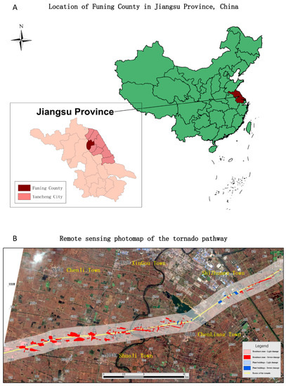 Location and pathway of the Funing tornado, 23 June 2016. (A) Location of Funing county in Jiangsu Province, China; (B) Remote sensing photomap of the tornado pathway.