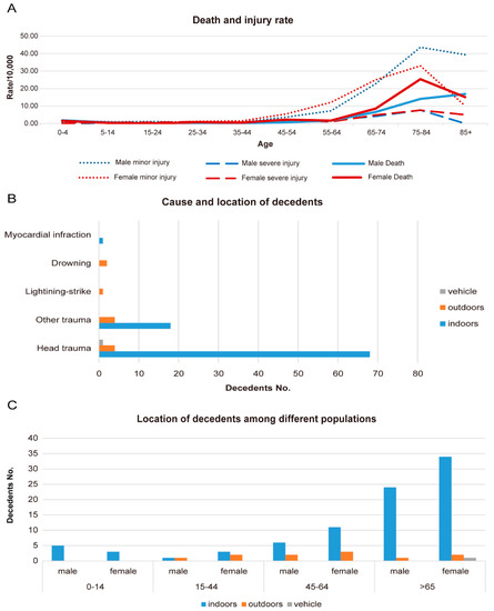 Characteristics of deaths and injuries of the tornado in Funing, 23 June 2016. (A) Death and injury rate among males and females; (B) cause and location of decedents; (C) location of decedents among different age and gender groups.