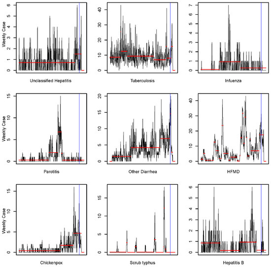 Change-points of notifiable infectious diseases in Funing from January 2010 to September 2016. Results show the time series (1st week, 2010–40th week, 2016) of weekly cases on nine notable infectious diseases. Blue line represents the onset of tornado.