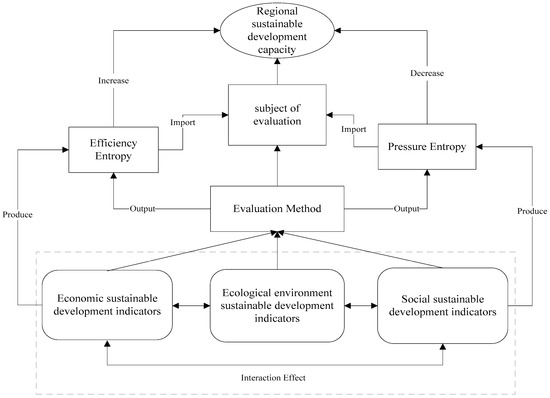 From the analysis of the regional system, it was found that along with energy production and exchange, regional internal operations and the external environment have close material and information transformations. At this level, the regional system matches the assumption of a dissipative structure. Therefore, the regional system quantitative method using information entropy is feasible for this paper. The regional system operation needs inner workings (human activities) to achieve material, energy and information production and exchange, so the system is open all the time. According to dissipative structure theory, information entropy flows in regional systems can be divided into efficiency entropy flows and pressure entropy flows according to their properties [23]. Pressure entropy flow (positive entropy) is the root of chaos in a regional system, as it encompasses human activities, increasing birth rates, pollutant emissions and energy consumption, all of which could have a negative influence on the regional system. Negative influences result in an increase in pressure entropy flow (positive entropy), which is closely related to spontaneity and initiatives in the system. Contrary to the positive entropy, the efficiency entropy flow (negative entropy) can effectively decrease the influence of positive entropy and eliminate the regional system’s internal chaos. In an open system, government construction investment, environmental protection and social construction can increase the negative entropy flow, meaning that the regional system constantly exchanges energy and information with the outside environment. Such an exchange pushes the system to develop in an orderly direction and, therefore, increase the sustainable development capacity of the system as shown in Figure 2. The generation of negative entropy is because of the external environment and organization. Therefore, based on the theory of information entropy, whether an operating system has a higher regional sustainable development capacity can be judged from the change in the system’s internal entropy flow.