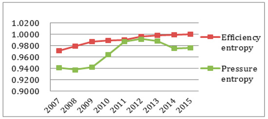 In Figure 7, the ecological environmental subsystem efficiency entropy flow is always lower, and has almost the same growth trend as the pressure entropy flow, except for 2007, which shows that the matters concerning pollutant emissions, energy consumption and nature environmental protection are increasingly serious. The efficiency entropy flow is higher than the pressure entropy flow in 2007, which proves that ecological environment problems have not been paid due attention. Meanwhile, as shown in Figure 8, the efficiency evaluation values is declining sharply in 2009, and the efficiency evaluation values are seriously below the pressure evaluation values after 2009. Combined with the entropy change and the evaluation value in the ecological environmental subsystem in Figure 11, the entropy change is negative, indicating that although measures are being taken in a timely manner, the effect is not so good. The sustainable development capacity in the ecological environmental subsystem is weak and needs effective measures to promote the sustainable development capacity.