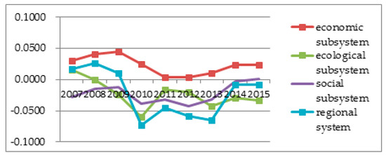 In Figure 11, the ecological environment subsystem entropy is negative, except in 2007, and the social subsystem entropy is also always negative, indicating there are no effective measures in Sichuan Province to promote ecological environment and social sustainable development. Although Sichuan Province’s economy has experienced rapid development, the investment ratio in social development and people’s livelihood security declines, which results in slower ecological environment and social development than economic development.