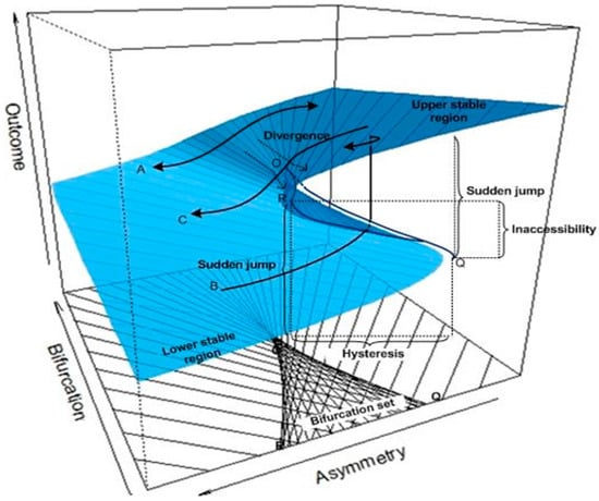 The catastrophe model was proposed in the 1970 by Thom, a topological scientist [5]. The cusp model was subsequently popularized by several researchers [5,17,19,20,21]. Among seven elementary catastrophes, the cusp catastrophe gained particular population. Based on findings from published studies, the cusp catastrophe is highly relevant for researchers as both a guidance and methodology to investigate phenomena with bimodal distribution and sudden jumps, an inaccessible middle region between these two modes, a delay between these transitions, and deviation from a linear relationship between the response outcome measure and the predictors.