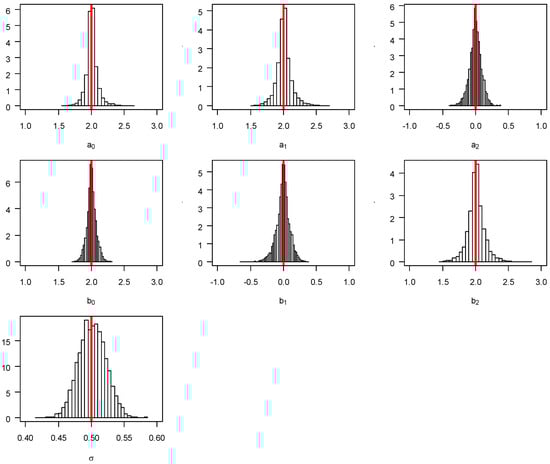 The unbiased property of the RegCsup model is also true for the estimated generated using Equation (6) (mean = median = 0.51 from the 5000 simulations, not presented in the table). The unbiasedness of the point estimates of the RegCusp model is graphically evident in Figure 2 where the first six charts are for the estimated regression parameters and the last charts for .