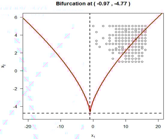 In this scenario, data are simulated using Equation (6) with = 0.5 and n = 300. Two predictors of x1 and x2 are generated from the standard normal distribution with true regression parameter vectors a = (2, 2, 0), b = (2, 0, 2) using Equation (8) with a2 = 0 (implying that x1 is an asymmetry variable) and Equation (9) with b1 = 0 (implying that x2 is a bifurcation variable). This parameterization is used to assess if the RegCusp can correctly identify the role of the two variables while detecting the cusp catastrophe from the simulated data.