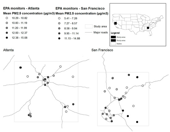 Study site definitions and Environmental Protection Agency (EPA) ground monitor distributions within the two study areas. Mean PM2.5 concentrations over the study period are displayed for each monitor.