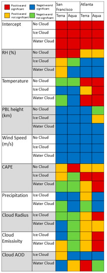 Precipitation, via the process of wet deposition, is associated with an overall decrease in PM2.5 mass that is larger in magnitude for soluble than for non-soluble PM species [40]. This was observed in our data consistently for ice clouds, which tended to precipitate more, and to some extent for water clouds. The impact of precipitation at the time of the overpass in San Francisco was also larger than that observed in Atlanta. Reasons for this could include the fact that we used a precipitation indicator instead of the precipitation rate, and that it rains more frequently in Atlanta than San Francisco, making the capture of rain during a MODIS overpass time less important relative to 24-h pollutant concentrations.