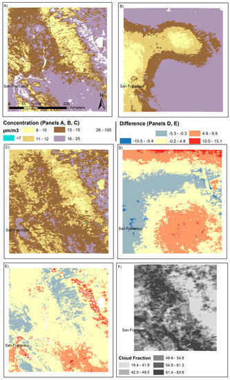 Case study results in San Francisco for January 2012. Results presented are mean concentrations in µg/m3 over the month of January for: (A) un-gap-filled surface (Equation (2)); (B) Harvard model gap-filled surface (Equations (2) and (3)); (C) Cloud gap-filled surface (Equations (1) and (2)); (D) the difference between the Harvard gap-filled and Cloud gap-filled results at the monthly level; (E) the difference between the ungap-filled and Cloud gap-filled results at the monthly level; and (F) the fraction of days with a water or ice cloud, as detected by the MODIS M*D06 cloud product.