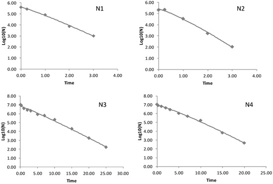 - Peleg, M. Microbial survival curves: Interpretation, mathematical modeling, and utilization. Comments Theor. Biol. 2003, 8, 4–5. [Google Scholar] [CrossRef]