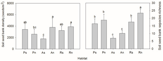 Soil seed bank density and species richness varied among different habitats (Ps/Pn—south/north-facing afforested slope land, As/An—south/north-facing abandoned slope land with spontaneous restoration, Rs/Rn—south/north-facing slope lands with remnant natural vegetation. The letters “a, b, c” above the bar indicates significant difference at the 0.05 level).