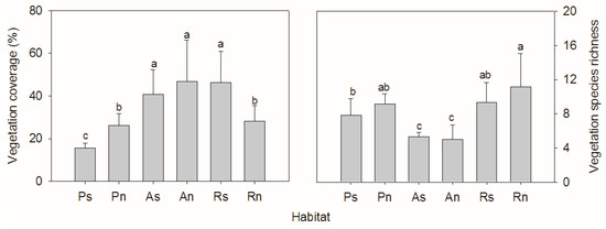 Vegetation coverage and species richness varied among different habitats (Ps/Pn—south/north-facing afforested slope land, As/An—south/north-facing abandoned slope land with spontaneous restoration, Rs/Rn—south/north-facing slope lands with remnant natural vegetation. The letters “a, b, c” above the bar indicates significant difference at the 0.05 level).