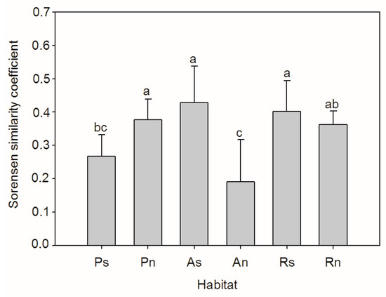 The Sorensen similarity coefficient between the soil seed bank and standing vegetation in different habitats (Ps/Pn—south/north-facing afforested slope land, As/An—south/north-facing abandoned slope land with spontaneous restoration, Rs/Rn—south/north-facing slope lands with remnant natural vegetation. The letters “a, b, c” above the bar indicates significant difference at the 0.05 level).