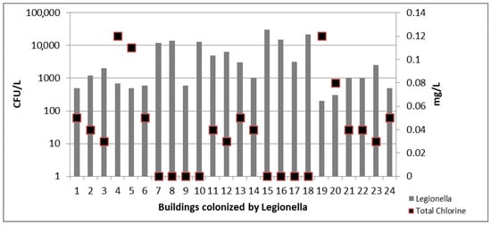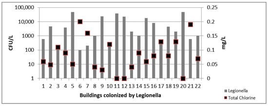 - Baggiani, A.; Casini, B.; Totaro, M.; Aquino, F.; Valentini, P.; Bruni, B.; Porretta, A.; Casalini, F.; Miccoli, M.; Privitera, G. Colonization by Legionella spp. of water networks in residential buildings of the province of Pisa, Italy. Ann. Ig. 2014, 27, 718–725. [Google Scholar]