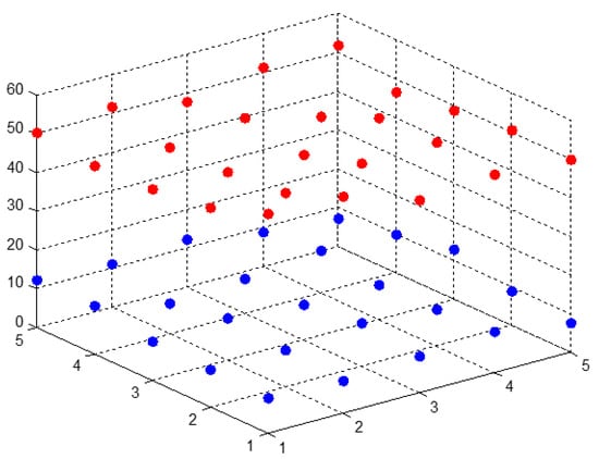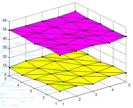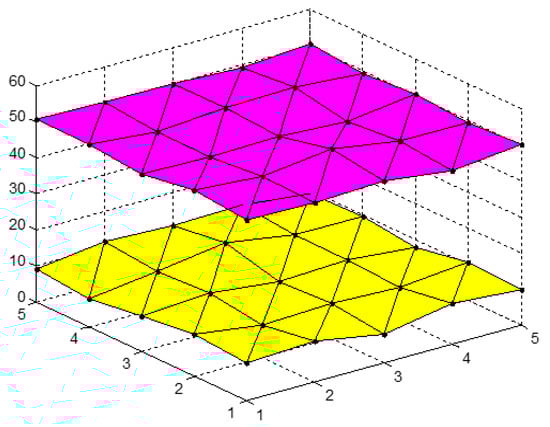 First, assume that is an index matrix sequence, and are corresponding surface clusters []. Three adjacent elements in the index behaviour matrix, , form a triangle, and multiple triangle surfaces form a single index behaviour matrix. Thus, the panel data, X, can be expressed as a series of curved surfaces as shown previously in Figure 1 and Figure 2.