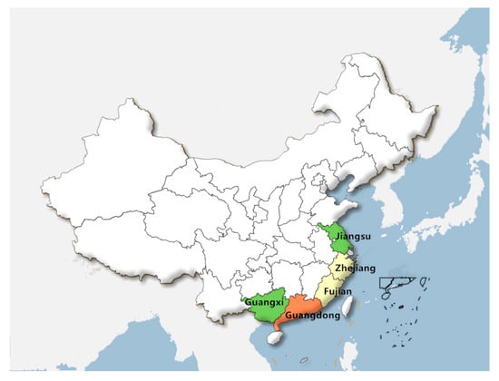 The DPGRA model results in Table 5 reflect a diagonal matrix, in which the diagonal values are each equal to one. Thus, we focused on correlation among the five provinces rather than correlation with the five provinces themselves. The estimated DPGRA degrees were highest between Fujian and Zhejiang (0.6992) and to a lesser extent Guangxi and Jiangsu (0.5377). The estimated DPGRA degrees among other provinces were relatively low. Both Fujian and Zhejiang are near the East China Sea with coastline lengths of 3023.6 and 2253.7 km, respectively. At these locations, storm surge frequency and intensity are analogical. Similarly, Guangxi is near the South China Sea with a coastline length of 1478.2 km and Jiangsu is near China’s Yellow Sea with a coastline length of 1039.7 km, resulting in comparable storm surge effects. Although Guangdong is also near the South and East China Seas, has a coastline length of 4314.1 km and experiences serious storm surge effects, this province did not exhibit high correlations with any other province. The regional characteristics of China coast main five provinces about storm surge are shown in Figure 5. Therefore, this comparative analysis not only further confirmed the validity and feasibility of the proposed PRGRA model but also proved its ability to highlight regional differences in need of further investigation.