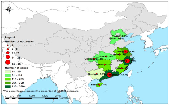 As to temporal distribution at the national scale, 0.8% (1/132) of identified outbreaks were reported in 2006, and 11.4% (15/132) were found in the first half of 2016. There was no outbreak reported in 2007. The outbreak cases showed a rising trend from 2006 to 2016, peaking in 2015, with that single year accounting for 46.2% (61/132) of the total reported outbreaks, as is shown in Figure 3.