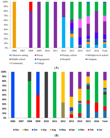 As for outbreak settings, closed public facilities, especially schools, played a pivotal role in the NoV outbreaks. Middle schools, primary schools and multiple-level schools were the most frequent sources of NoV outbreaks, accounting for 28.8% (38/132), 28.0% (37/132) and 12.1% (16/132) of all outbreaks respectively. Kindergartens and colleges accounted for 9.8% (13/132) and 8.3% (11/132) of infections, respectively. Companies, hospitals, communities and prisons accounted for 4.5% (6/132), 2.3% (3/132), 3.8% (5/132) and 0.8% (1/132) respectively. The type of settings for 1.5% (2/132) of outbreaks was not clear. In 2006, the only one outbreak occurred in a community. After 2008, middle schools became the predominant settings, but the proportion of primary schools and multiple-level schools increased since 2013, as is shown in Figure 2A. The attack rate of outbreaks in prisons was the highest at 11.7% (147/1260), followed by kindergartens at 8.9% (384/4323), unknown settings 5.6% (237/4269), hospitals 4.5% (303/6705), primary schools 3.8% (1969/52,113), companies 3.5% (208/5923), middle schools 2.3% (2069/88,245), multiple-level schools 1.6% (1187/73,196), communities 1.3% (383/29,314) and colleges 0.9% (1246/140,159). The attack rates among the settings were significantly different (p < 0.05).