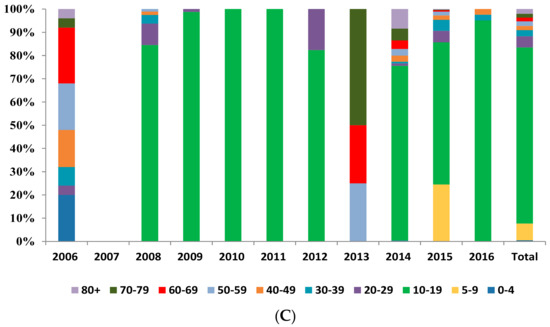 Examining age distribution, cases ranged in age from nine months to 93 years, with a median age of 17 years. The age groups, ordered by the number of cases they accounted for, are: 10–19 years, 75.7% (933/1232); 5–9 years, 7.2% (89/1232); 20–29 years, 4.9% (60/1232); 30–39 years, 2.6% (32/1232); 80+ years, 2.0% (25/1232); 50–59 years, 1.9% (24/1232); 40–49 years, 1.9% (23/1232); 60–69 years and 70–79 years, each 1.6% (20/1232); and 0–5 years, 0.5% (6/1232). In 2006 and 2013, the dominant age groups were 60–69 years and 70–79 years, accounting for 24.0% (6/25) and 50.0% (4/8) of the outbreak cases. The age distribution in other years was similar during 2006 to 2016, as is shown in Figure 2C. The distribution of NoV outbreak cases from 2006 to 2016 in China was quite equal across sexes (male vs. female = 1.1:1.0). The age group difference between male and female was significant (p < 0.05).