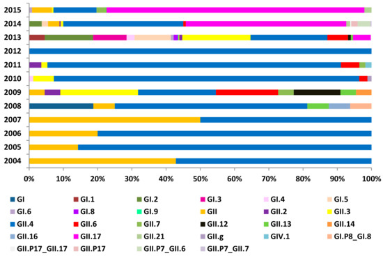 Percentage of total norovirus genotypes during 2004 to 2015. The bar in the figure was generated by the number of genotypes (n = 1291).