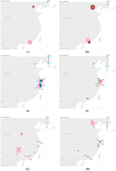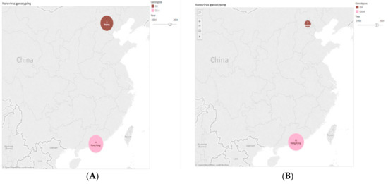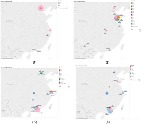 The locations of outbreaks were geocoded by the Google Map geocoding service (https:// google-developers.appspot.com/maps/documentation/javascript/examples/geocoding-simple). Then, ArcGIS (ArcMap, 10.2 version, ESRI Inc., Redlands, CA, USA) was used to generate a spatial distribution map for NoV outbreaks. In order to interactively display the various genotypes in different temporal periods and locations, we used Tableau 9.3 version (Tableau, Seattle, WA, USA) to filter out the temporal period and display the profiles of genotypes at each outbreak location.