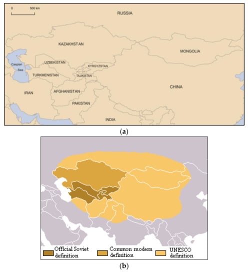 Defining Central Asia—(a) identifies national borders in the region; (b) reflects Soviet, common and UNESCO definitions of Central Asia covering vastly different regions [16].