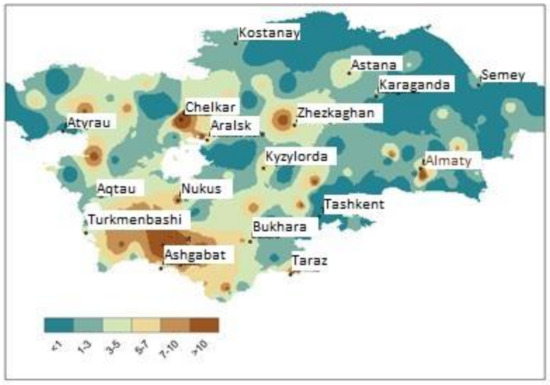 During the Soviet era, Central Asia experienced severe land degradation with excessive livestock exploitation and radical transformation of agricultural practices [13]. In Kazakhstan, Turkmenistan and Uzbekistan land degradation followed Khrushchev’s infamous, environmentally damaging, ‘Virgin lands’ farming expansion diktat [51]. Their natural desert pastures have been transformed into vast agricultural exploitations [4,52]. Against the warning of scientists, Soviet management turned out to be extremely inefficient despite vast irrigation expansion programmes. Due to its overexploitation as water resource for agriculture, the Aral Sea basin lost more than 70% of its volume in five decades and the region has been proclaimed an ecological disaster zone [4,53]. Water demand from the Amu Darya and Syr Darya rivers, as well as the Kara Kum Canal of Turkmenistan kept increasing, which resulted in Aral Sea water table collapse [26]. As a consequence of the drop in the Aral Sea level, new dry areas became active hotspots of dust storms [4]. The bottom of the sea salts, and then fertilisers, pesticides, herbicides, and other conditions that affect health and hygiene (especially water and sewage), supplied the dust storms with particles that are chemically detrimental to human health. The Aral Sea loss [54] is a striking example of how disturbance of the natural landscape contributes to dust and health impacts. Intensive water diversion upriver for farming has exposed the seafloor and salty flats that are now the source of severe dust storms with very high amount of PM10 particulate (Figure 2) [5].