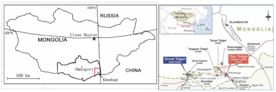 Map showing Khanbogd Soum, Mongolia (left); (right) mining sites, including Oyu Tolgoi, in Omnogovi Province, Mongolia [99].
