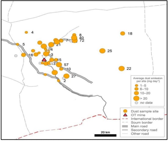 Mongolia has been called ‘the next Qatar’ for its great abundance of mineral resources and small population [91]. At the same time, it is considered as a major natural dust source [92]. In Southern Mongolia, two of the world’s largest mines—the vast Oyu Tolgoi copper/gold excavation and Tavan Tolgoi coking coal mine—have provided >US$1 billion in tax revenue at significant environmental and social costs. As Rio Tinto Corporation expands its $12 billion Oyu Tolgoi (OT) mine, there have been several concerns about dust-related health impacts of the mega-mine on local communities [80], a concern acknowledged by the mine [93]. Road dust generation (paved vs. unpaved), particulate implications for animal health and dust mitigation efforts by the mine have been significant citizen concerns. Conditions have resulted in formal complaints to the World Bank and attempts to halt mining for failing to address detrimental impacts [15,94]. Efforts in Mongolia reflect increased awareness of the potential damage caused by mining processes. New research in Mongolia is concerned with dust impact on both human and livestock health (Table 2). This paper goes a step further in investigating widespread dust in the vicinity of the Oyu Tolgoi mine.