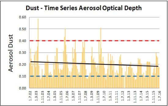 MODIS remotely sensed aerosol dust assessment in Khanbogd Soum programme [103]. A value of 0.1 = very clear—blue dotted line; 0.4 = very dusty—red dotted line. Black line represents aerosol dust trend from July 2002 to July 2016 showing slight decreasing trend in soum-wide dust over time (r2 = 0.033).