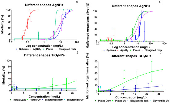 Spherical Ag NPs with nominal size of 20 nm (nominal surface to volume ratio 0.3) were purchased from SkySpring Nanomaterials, Inc. (Houston, TX, USA). A suspension of Ag nanoplates was obtained from Moscow State University (Moscow, Russia). Elongated Ag rods with a nominal size of 50 nm × 0.6 to 12 μm (nominal surface to volume ratio of 0.08) in suspension were purchased from Fraunhofer ISC (Würzburg, Germany). Spherical TiO2 NPs with a nominal size of 20 nm (nominal surface to volume ratio 0.3) were obtained from Io-Li-Tec nanomaterials (Heilbronn, Germany). Bipyramidal TiO2 NPs and TiO2 nanoplates were obtained from the Centre of BioNano Interaction (University College Dublin, Dublin, Ireland). The Ag nanospheres and nanoplates were coated with PVP (polyvinylpyrrolidone), and all other NPs were uncoated. Stock solutions were prepared by weighing dry powdered Ag or TiO2 particles and adding them into egg water (consisting of 60 μg/mL Instant Ocean Sea Salt, Sera Marin, in Milli-Q water, pH 6.5–7.0). Ag+ solutions were obtained by adding silver nitrate (AgNO3: CAS 7761-88-8, Sigma Aldrich, Zwijndrecht, The Netherlands) to egg water. All stock solutions were freshly prepared and sonicated for 10 min in an ultrasonic water bath (USC200T, VWR, Amsterdam, The Netherlands). Prepared stock suspensions or manufactured suspensions were diluted using egg water and embryos were exposed immediately after preparation.