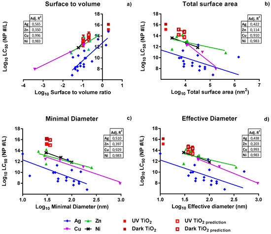 Dose metrics to be used within the dose-response modelling were chosen to be: minimal diameter, surface area, effective diameter, and surface to volume ratio. In each case, actual size information (obtained via TEM images) of the metallic NPs was used. When agglomeration occurred, identifiable single NPs present as commonly present on the surface of the agglomerates were used for size measurements. Only pristine sizes as derived from the TEM images were used for modeling, as is common for i.e., nano-QSAR (Quantitative Structure–Activity Relationship; [