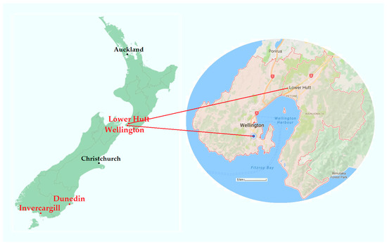 Locations of Wellington, Lower Hutt, Dunedin, and Invercargill. Map attribution: Ozhiker, and Google Maps.