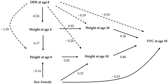 Analytical path model showing statistically significant, standardized, direct, and indirect effects of DDE exposure at eight years of age, height and weight at eight and ten years of age, and FVC at age 10 years. The path coefficients represented by solid arrows are direct effects, while those represented by dashed arrows are indirect effects. Associations with non-significant total effects are not shown in this diagram. Goodness of fit criteria: χ-squared test statistic = 33.1, p-value < 0.05; AGFI = 0.898; CFI = 0.994; RMSEA = 0.048.