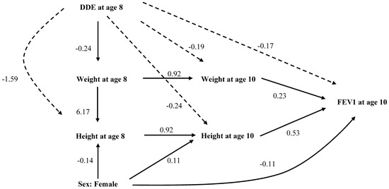 Analytical path model showing statistically significant, standardized, direct, and indirect effects of DDE exposure at eight years of age, height and weight at eight and ten years of age, and FEV1 at age 10 years. The path coefficients represented by solid arrows are direct effects, while those represented by dashed arrows are indirect effects. Associations with non-significant total effects are not shown in this diagram. Goodness of Fit Criteria: χ-squared test statistic = 33.7, p-value < 0.05; AGFI = 0.909; CFI = 0.994; RMSEA = 0.043.
