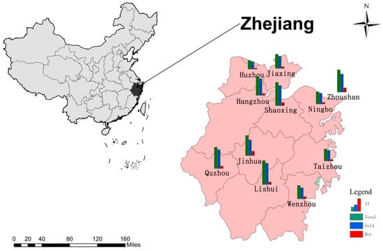 We collected daily mortality and meteorological data from 11 cities in Zhejiang Province, China. In total, there were seven coastal cities (Hangzhou, Jiaxing, Ningbo, Shaoxing, Taizhou, Wenzhou, and Zhoushan) and four inland cities (Quzhou, Jinhua, Lishui, and Huzhou). Zhejiang Province is located in the southern part of the Yangtze River Delta on the east coast of China with a total land area of 105,500 km2 and a population size of 55.9 million in 2016. There are four distinct seasons and overall pleasant climate. The annual mean temperature ranges from 15.0 to 18.0 °C, and the average annual rainfall is 980 to 2000 mm across cities. Figure 1 shows the geographical distribution of the 11 cities in Zhejiang.