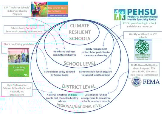 At the individual school level, informational resources such as those available from the PEHSU network on children’s health in the aftermath of floods [] and returning to impacted areas [] can help guide school decision makers and committees. The EPA Indoor Air Quality Design Tools for Schools offers help to school districts and facility planners to improve the indoor learning environment []. And, in terms of psychosocial and emotional resilience, multiple institutes and initiatives, such as Collaborative for Academic, Social, and Emotional Learning (CASEL), University of Southern California National Center for School Crisis and Bereavement, and University of California Santa Barbara’s Mental Health Matters curriculum, are supporting school-based social and emotional learning that can bolster school communities before, during, and after disasters [,,].