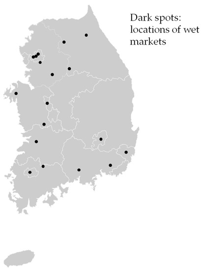 Chicken (n = 152) and duck (n = 154) carcasses were purchased from 18 wet markets throughout Korea during the summer (June–August, in 2014) and winter seasons (December in 2014 to February in 2015) (Figure 1). Three to ten samples for both chicken and duck carcasses were collected per market and per visit, and each market was visited twice for summer and winter. The samples were placed in a cooler on ice and transported to a laboratory. They were analyzed within 24 h.