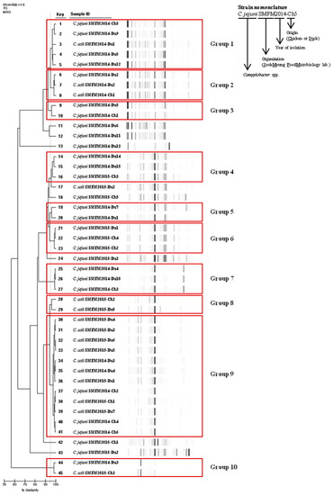 To analyze the genetic diversity, 45 Campylobacter isolates from poultry were streaked on Colombia agar (bioMérieux, Marcy-l’Étoile, France), followed by microaerobic incubation at 42 °C for 48 h. DNA was extracted from Campylobacter isolates using a commercial kit (UltraCleanTM Microbial DNA Isolation Kit, MoBio Laboratories, Solana Beach, CA, USA). The extracted DNA was amplified using DiversiLab Campylobacter Kit (bioMérieux, Marcy-l’Étoile, France). The amplified products were separated by electrophoresis on microfluidics chips (Agilent Technologies, Palo Alto, CA, USA) and analyzed with the Agilent 2100 Bioanalyzer (Agilent Technologies, Palo Alto, CA, USA). The peak and band data were analyzed by DiversiLabTM software version 2.1.66 (bioMérieux, Marcy-l’Étoile, France) using Pearson’s correlation coefficient and unweighted pair group method with the arithmetic mean, followed by dendrogram generation. The cutoff value was 95% for determining genetic similarity [33,34].