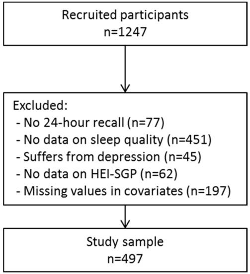 Of the 1247 recruited pregnant women, we excluded those with no information on dietary intake (n = 77), or sleep quality (n = 451). Furthermore, we excluded those with probable major depression (n = 45), because sleep problems can be a feature of depression [30] and those with missing values in the covariates (n = 197), resulting in a total study sample of 497 participants (Figure 1). As we excluded a considerable amount of participants without information on sleep quality and duration, we reran the principal components analyses with Varimax rotation to check whether similar dietary patterns emerged in this subsample. The newly emerged dietary patterns were similar, as indicated by similar food/food groups loading highly on the dietary patterns in similar extent, and by the moderate to strong correlation coefficients with previously obtained dietary patterns (rVFR = 0.95, rSFN = 0.94, rPCP = 0.32; Table S1).